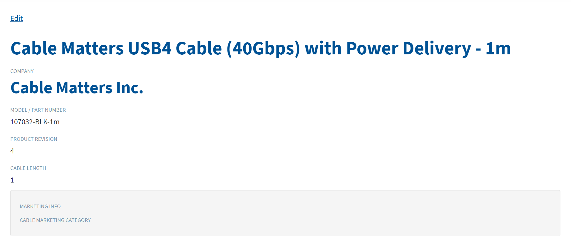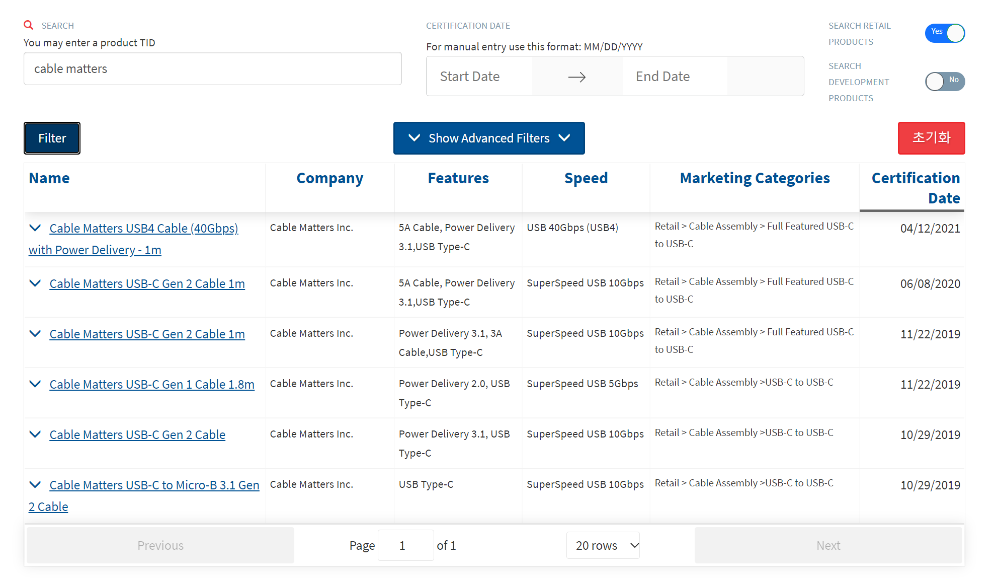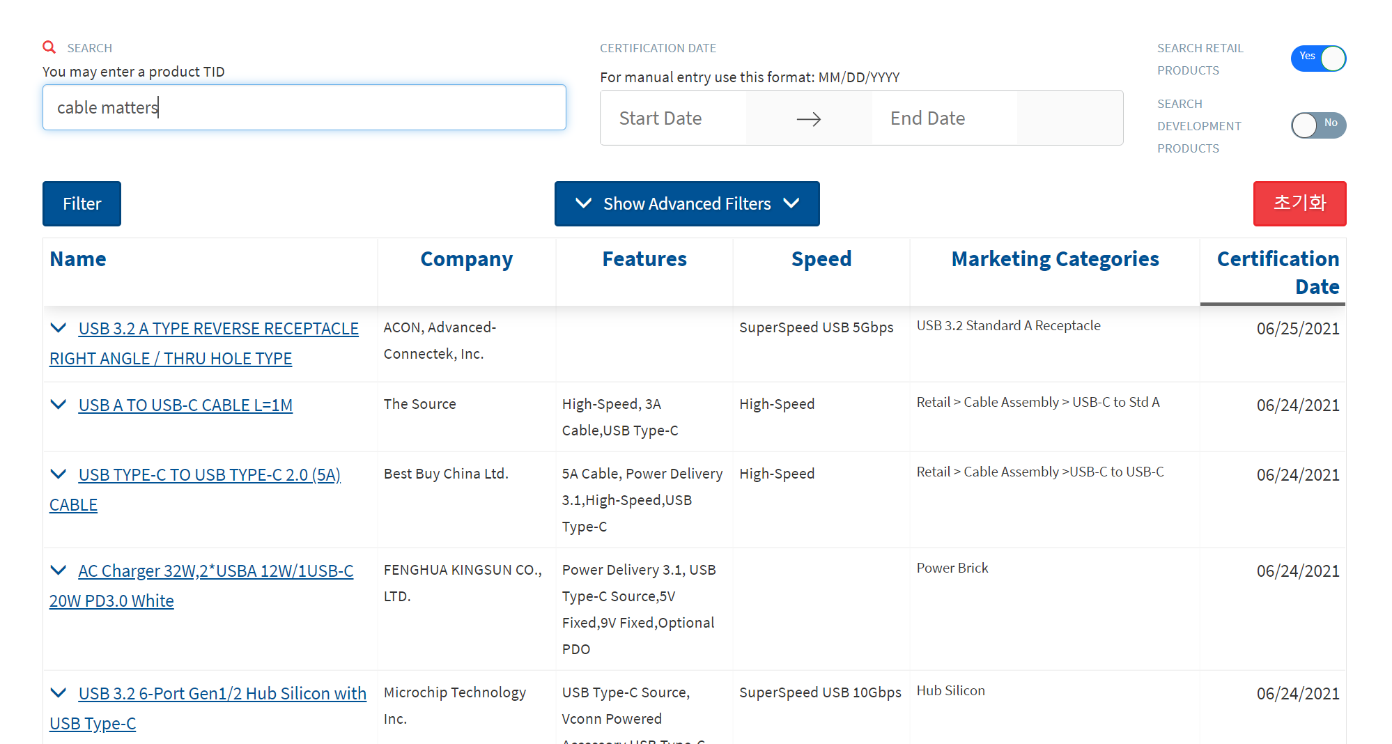 "Cable Matters"의 USB인증 제품 목록을 확인할 수 있습니다.