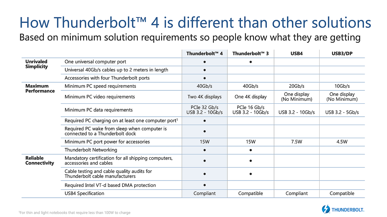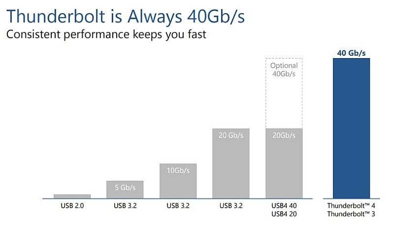 두 표준 모두 40Gb/s의 최대 대역폭을 자랑하지만 Thunderbolt 4의 경우 최소 요구 사항인 반면 USB4의 경우 최소 사양은 실제로 20Gb/s임을 명확히 했다.