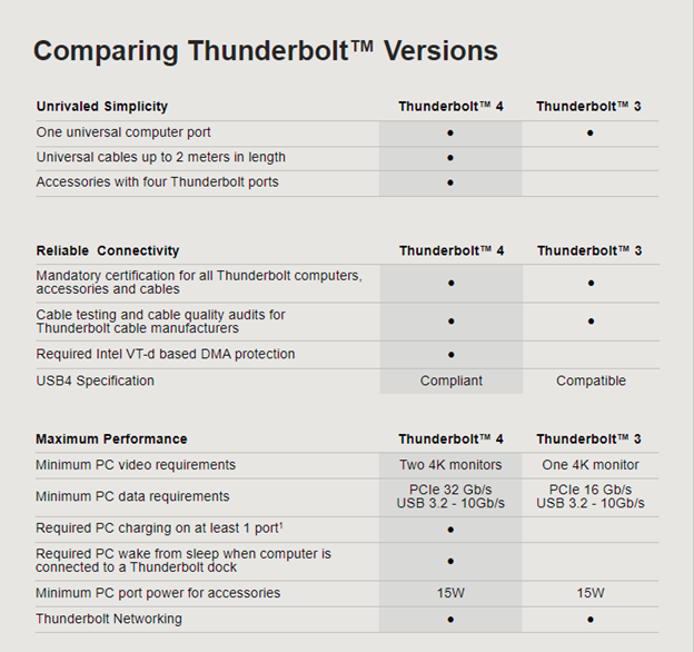 다시 말해 Thunderbolt 호환 장치는 진정한 Thunderbolt 솔루션이 아니라 동일한 USB-C 연결을 활용한다. Thunderbolt 3이 장착된 컴퓨터는 모든 USB-C 장치를 지원하지만, 실제 Thunderbolt 장치만 Thunderbolt 3이 제공하도록 설계된 더 높은 성능 기능, 인증된 신뢰성 및 안정성을 제공한다.
