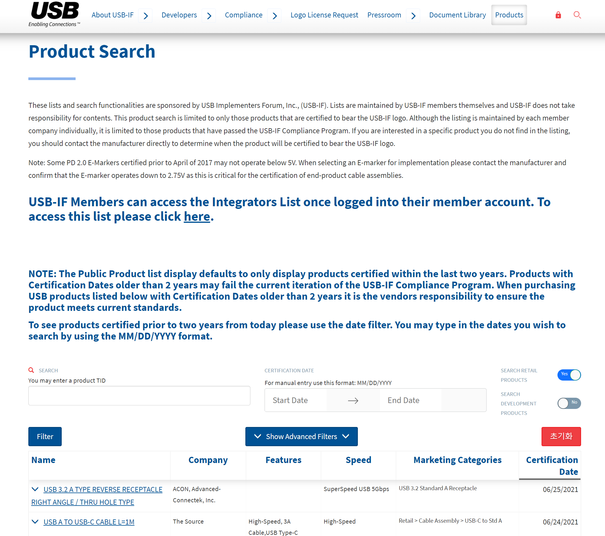 제품 회사의 정보가 모두 USB-IF에서 확인이 가능합니다.
