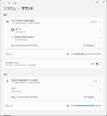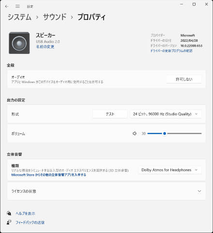 사운드의 속성.여기에서는 음성 출력 품질(양자화 비트 수/샘플링 주파수)나 입체 음향이 선택할 수 있다."Dolby Atmos for Headphone"은 유상이지만 컴퓨터로 동영상 전달 서비스 등도 이용한다면 구입을 추천한다