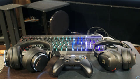 게이밍 키보드, 컨트롤러와 함께 게이밍 헤드폰을 늘어놓은 곳