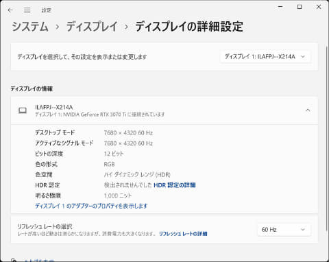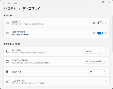 디스플레이 설정 화면.해상도는 8K(7,680×4,320)에서 HDR도 온으로 있다.8K에서는 창이 작기 때문 200%로 확대되었다
