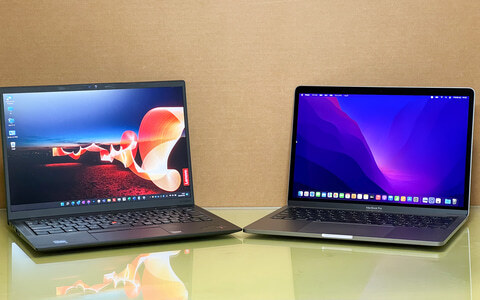 왼쪽이 Core i7-1280P을 탑재한 Lenovo ThinkPad X1 Carbon Gen 10, 오른쪽이 M2를 탑재한 Apple 13인치 MacBook Pro 13(2022모델)