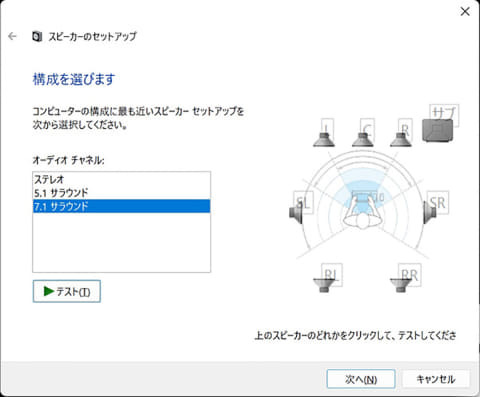 스피커의 셋업 화면.SXFI THEATER에서는 7.1서라운드가 선택할 수 있으므로, 이곳에서 설정한다.METEOR ONE의 경우는 스테레오만 된다