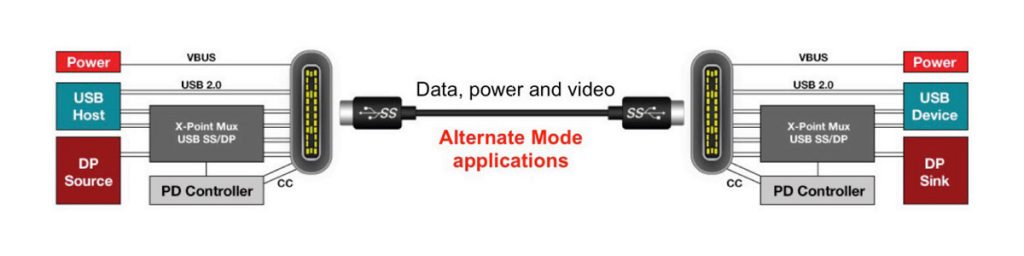 USB Type-C는 24핀 양면 커넥터를 활용하므로 장치 제조업체가 대체 모드를 활성화하여 장치와 호스트 간 직접 전송을 위한 대체 데이터 프로토콜을 사용할 수 있습니다. 이를 통해 호환되는 어댑터를 사용하여 단일 USB Type-C 포트에서 VGA, HDMI, DisplayPort, Thunderbolt, 이더넷 또는 기타 연결 유형을 출력할 수 있습니다.