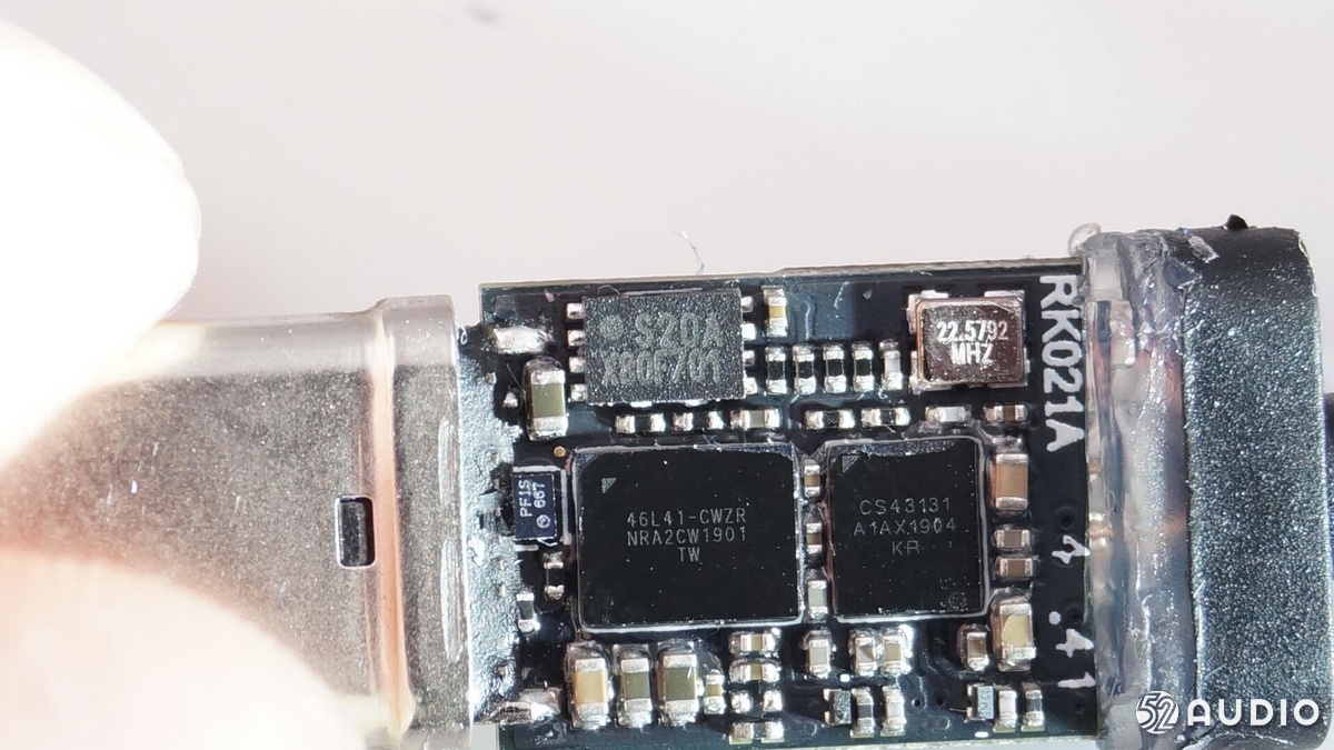 Cirrus Logic 46L41-CWZR과 Cirrus Logic CS43131 2 개의 고품질 오디오 칩이 내장 된 46L41-CWZR은 USB 오디오 입력 제어 및 일반 오디오 디코딩을 담당하며, CS43131은 고화질 오디오를 파싱하고 대형 임피던스 헤드폰을 구동합니다.