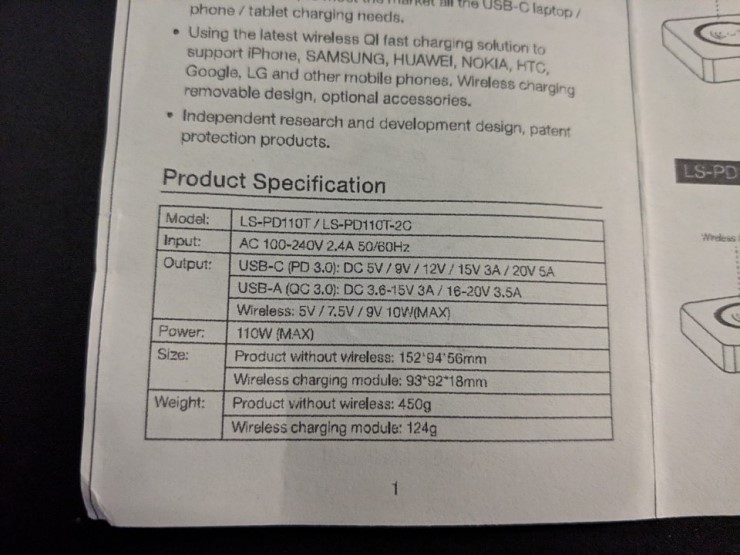 랩탑 충전을위해 최대 85W의 5V / 9V / 15V / 20V에서 USB PD 2.0을 지원 합니다.스마트 폰 충전을위한 5V / 2A를 제공합니다.4