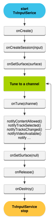 For your service, you extend the TvInputService class. A TvInputServiceimplementation is a bound service where the system service is the client that binds to it. The service life cycle methods you need to implement are illustrated in figure 1.