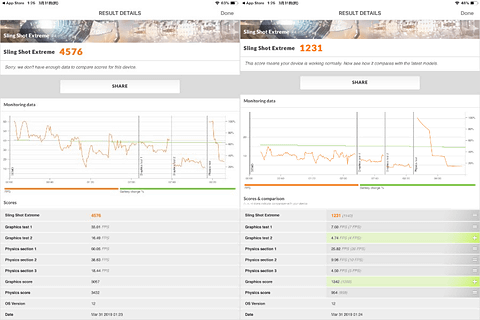 Sling Shot Extreme의 벤치 마크 값 비교. iPad mini 4 (오른쪽)에 비해 어떤 점수도 3 ~ 5 배 정도의 값을 내쫓고있다