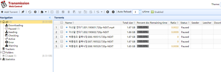 이후 트랜스미션UI로 가보면 토렌트가 추가되어 있습니다.
