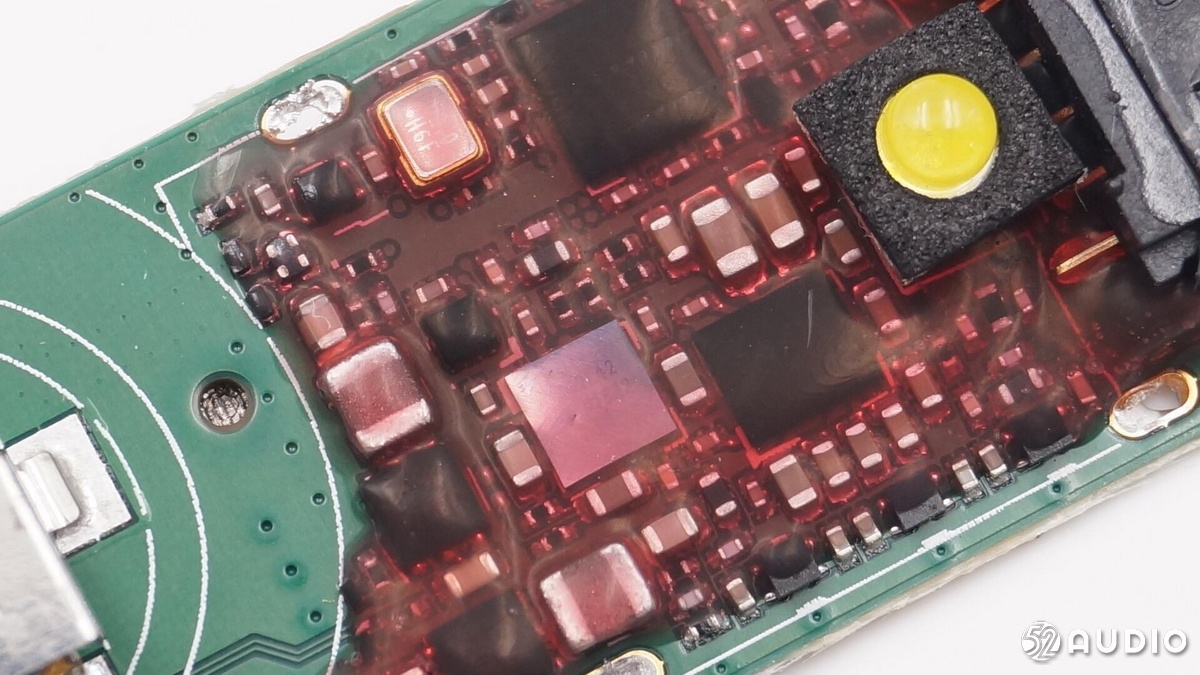 여러 칩과 커패시터는 수분 보호를 위해 적색 반투명 실런트로 덮여 있습니다.