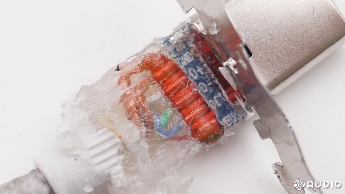 금속 커버가 열리고 전체 플러그 부분이 투명한 접착제로 덮여 있습니다. 회로 기판에 커패시터가 있으며 외부 노란색 와이어는 인장 섬유입니다.