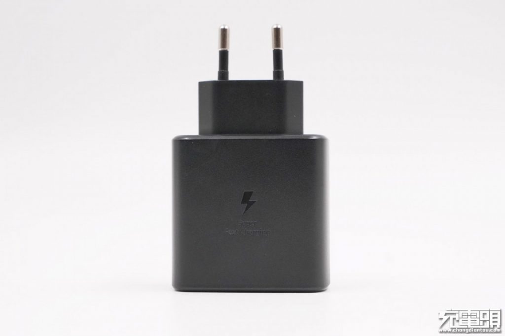 우리 단위는 유럽 버전입니다. 무광택 마감 처리되어 있으며 삼성 충전기 제품군의 친숙한 모양이며, 횡적입니다. 중앙에 Samsung Super Fast Charging 로고가 새겨 져 있습니다.