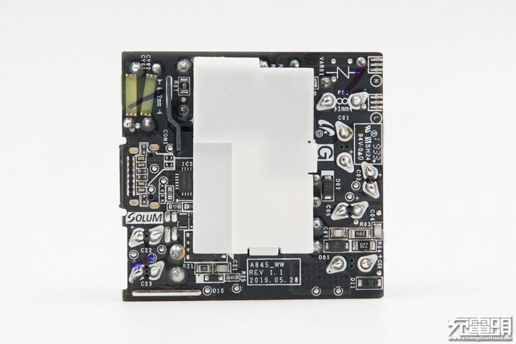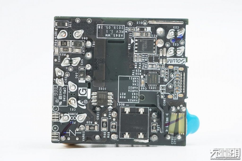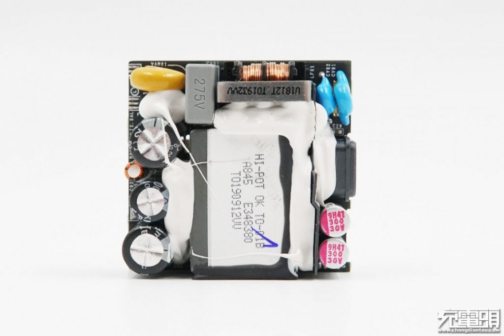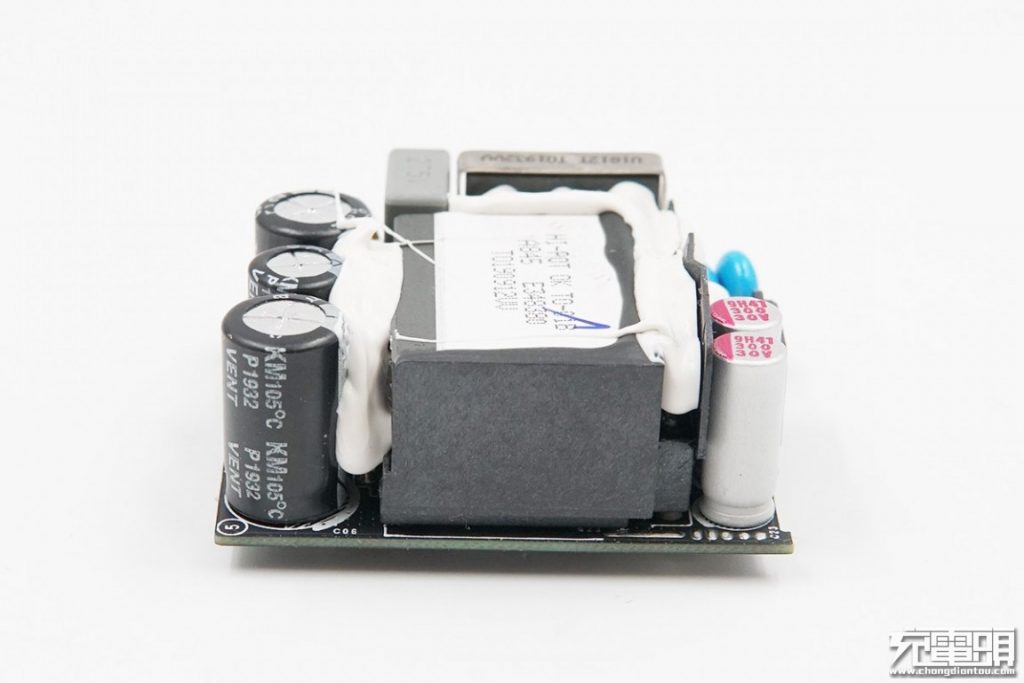 출력측은 필터링을 위해 2 개의 솔리드 커패시터를 사용합니다. 중앙은 검은 색 고무 코어가있는 맞춤형 USB-C 포트입니다. 두 개의 파란색 Y 커패시터가 병렬로 연결되고 플라스틱 절연 보드가 변압기와 보조 구성 요소 사이에 배치됩니다.