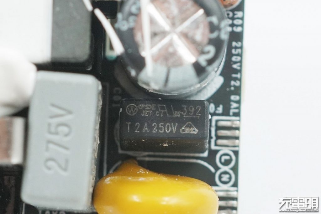 입력 측에는 오른쪽에서 왼쪽으로 3 개의 깔끔하게 배열 된 1 차측 필터 전해 커패시터, 주황색 PWM 칩 전원 커패시터, 안전 X 커패시터 및 노랑 바리스터가 있습니다.