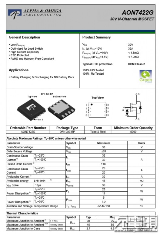 USB-C 포트 용 VBUS 스위치, AOS의 AON7422G