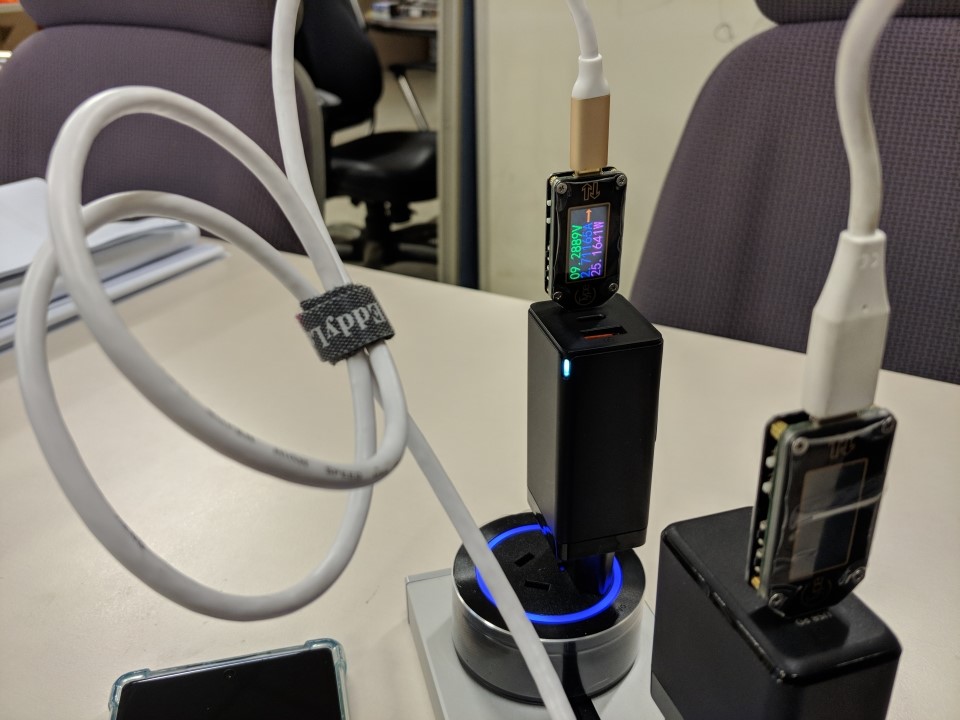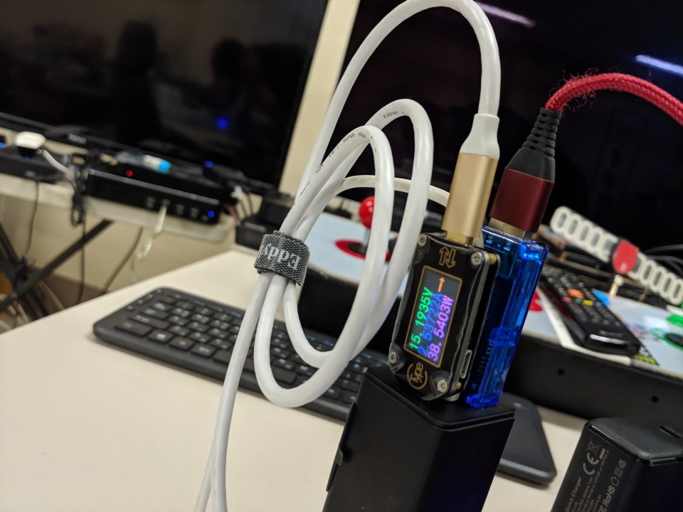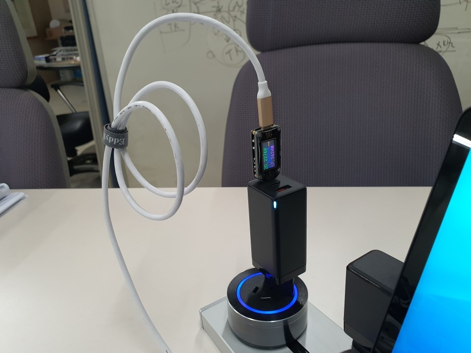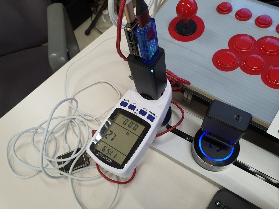 Baseus 65W 2C1A 3포트에 USB-C 측정기기를 모두 꼽아서 test 하려니, 안습이네요 ㅠ.ㅠ 그래서 1개는 케이블로 연결했습니다.