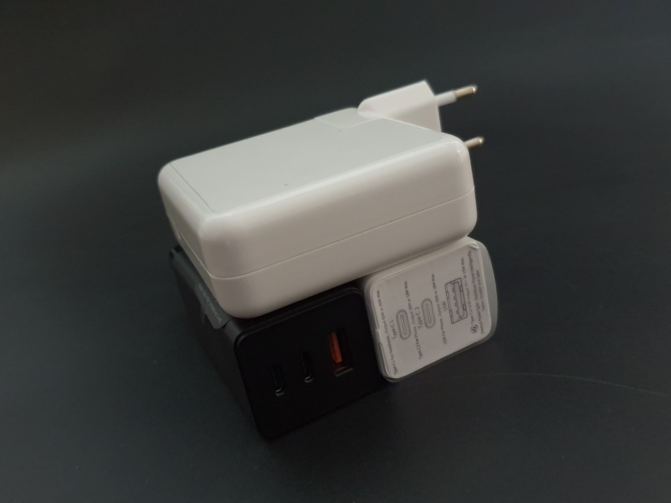 Apple 61W용 짭 충전기와 Baseus 65W 2C1A 사이즈를 비교 하면,