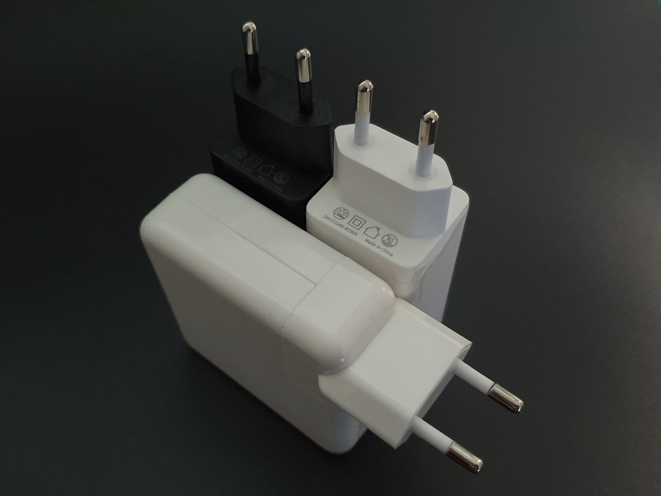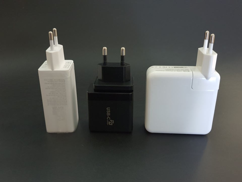 충전기 용량이 거의 비슷한 제품 3가지를 비교해 보았습니다. 오른쪽은 Apple 61W용 짭 충전기이고, 중간제품은 앞서 소개해 드린 GaN 65W 1C 제품(KC인증 중) 입니다.
