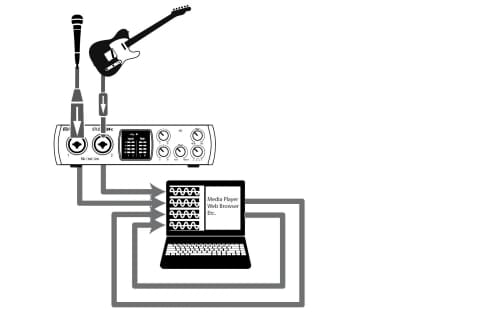 그래서 이 상태에서도 "Virtual 1/2(Studio 24c)"쪽에는 아무것도 신호는 들어오지 않는다. 그러나"가상 1/2"을 선택하면 혼합되는 것이 아니라 그것과는 독립한 형태로 신호가 돌아오고, 이것이 "Virtual 1/2(Studio 24c)"으로 들어오는 것이다.이에 의한 멀티 포트 입력을 지원한 기재하면, 리얼 입력과 루프 백 입력의 균형을 잡기가 쉽게 할 수 있는 장점도 있다.