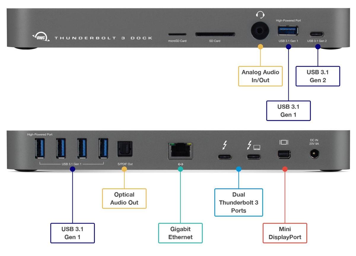 OWC의 Thunderbolt 3 도크에서 레이블이 잘 지정된 포트