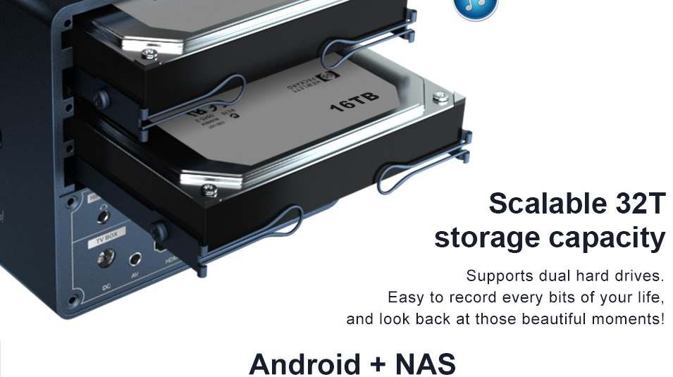 우리가 이미 그 세부 사항 중 일부를 보았던이 Android TV-Box는 처음에 두개골로 장식 된 큰 금속 상자로 우리를 놀라게합니다. 내부에는 강력한 Amlogic S922X-H SoC , 전용 전문가급 오디오 칩 ESS DAC-ES9018 및 최대 16TB의 드라이브를 지원하는 2 개의 3.5 인치 SATA 디스크 용 하우징이 있습니다.