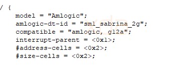 주요 DTS 파일은 매우 길고 (~ 4,200 줄) Android 용 Linux 커널 개발에 대한 지식 없이는 구문 분석하기 어렵 기 때문에이 기사에서 전체 파일을 게시하지는 않습니다. 하지만 파일 맨 위에서“Sabrina”Android TV 동글 장치에 대한 두 가지 주요 세부 정보를 볼 수 있습니다. 2GB RAM (sml_sabrina_ 2g )이 있으며 Amlogic S905X2 시스템 온 칩 (참조 아래에 표시되지 않은 코드 명 "meson"에 대한 다중 참조는이를 확인합니다).