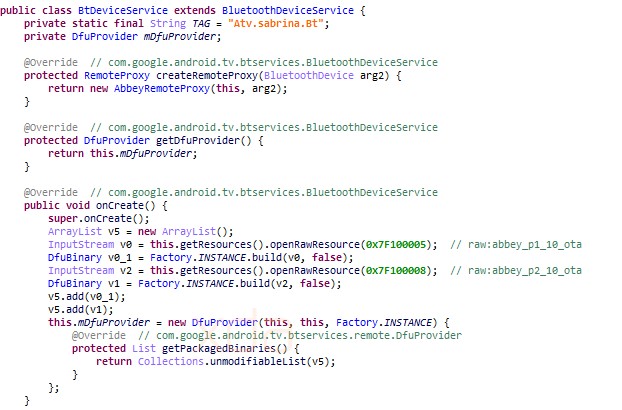 SabrinaService의 또 다른 클래스는 전용 리모콘이 Bluetooth를 통해 장치에 연결될 가능성이 있음을 밝힙니다. (아래 스크린 샷의 DFU는 "장치 펌웨어 업데이트"를 나타냅니다.)
