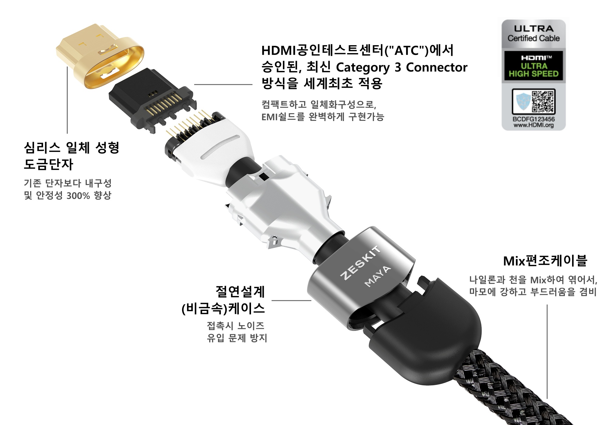 Zeskit Ultra HD 고속 HDMI 케이블은 공인 테스트 센터("ATC")에서 테스트한 승인된 Category 3 커넥터를 사용한다.