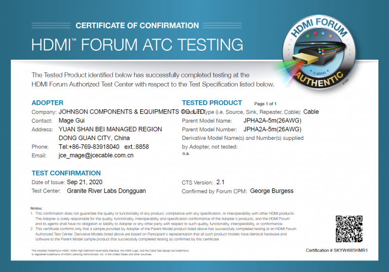 – JCE(CTi Group의 회원)는 고성능 케이블 어셈블리 제조업체로 HDMI 라이센싱 관리자로부터 Ultra High Speed HDMI® 케이블 인증을 받았습니다.