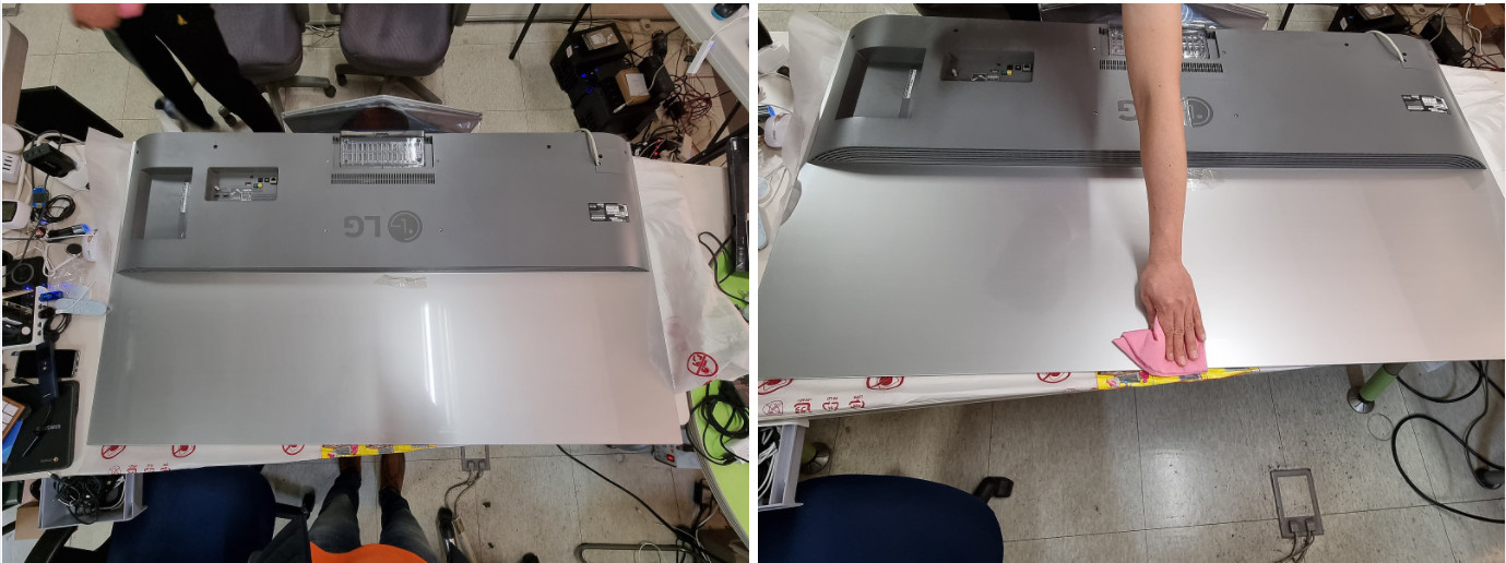 접착테이프가 잘 붙을 수 있도록 TV뒷면 청소를 먼저 하였습니다.