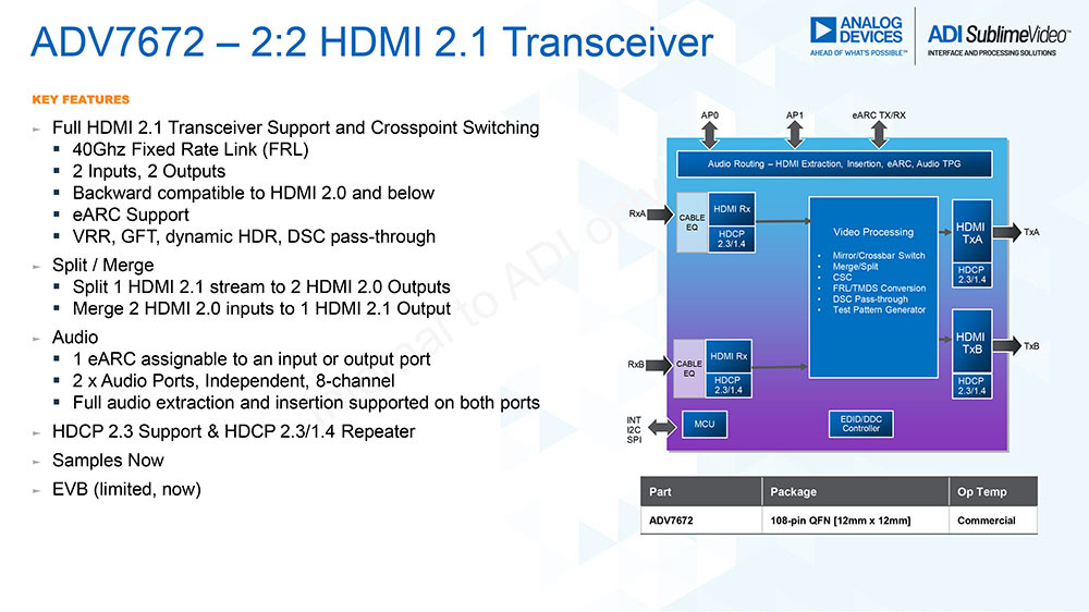 마츠 무라 최근 신제품으로 'ADV7672'을 발표했다. 이것은 HDMI 2 입력, 2 출력을 갖춘 칩입니다. 전송 속도는 10G 비트 × 4 레인의 40Gbps 지원하므로, 8K / 60p / 4 : 2 : 0의 10 비트 신호가 통과합니다. 물론 4K / 120p / 4 : 4 : 4 10 비트 신호도 괜찮습니다.