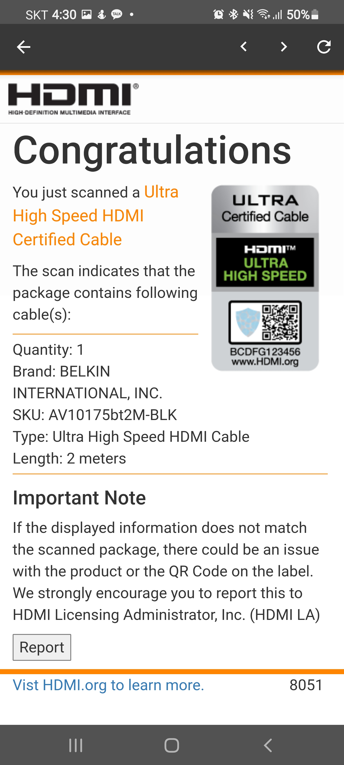 2M 벨킨 HDMI2.1 인증 케이블 인증 상태 정보를 확인하였습니다.