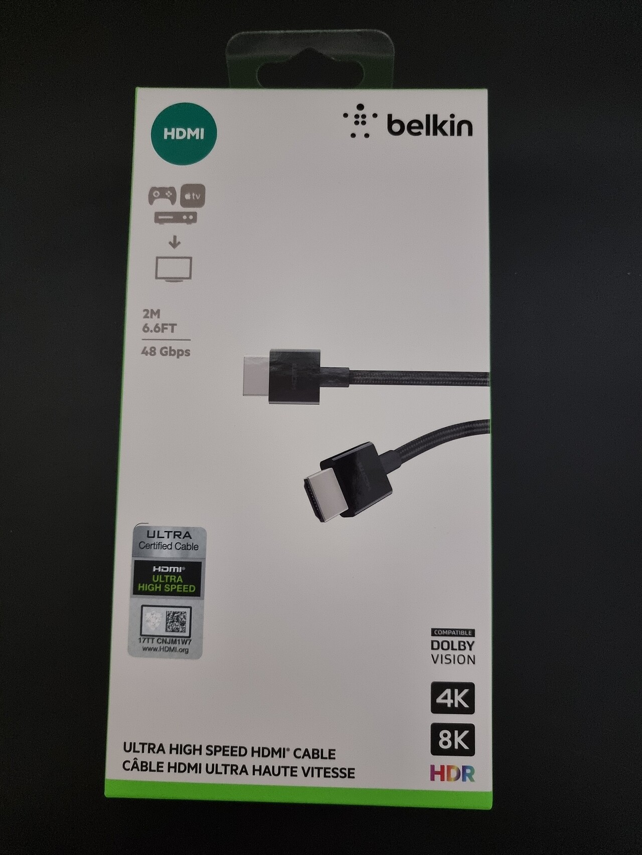 Belkin Ultra HD High Speed HDMI 2.1 Braided Cable - 6.6ft/2m 4K, Supports 4K/120Hz and 8K/60Hz, Dolby Vision/HDR 10 Compatible, 48Gbps