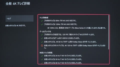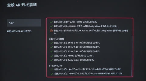 Xbox Series X의 최신 펌웨어 적용 후 "일반"- "4K 텔레비전 세부 사항"항목을 열면 연결된 디스플레이 장치가 지원하는 다양한 기술 항목 / 기능 항목의 ○ × 표가 나타난다. Xbox Series X 사용자는 한 번 확인하고 싶은 테스트이다. 2020 년 모델의 OLED48CXPJA는 당시 몇 안되는 모든 항목 올 OK 모델 이었기 때문에, 필자를 포함한 많은 게임 팬들이 깜짝 놀란