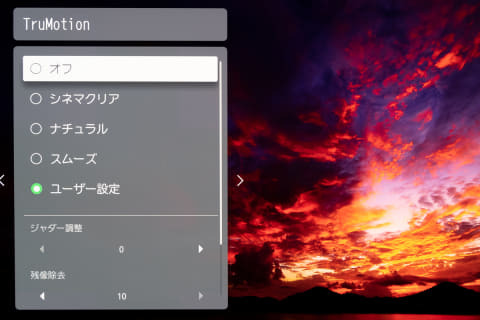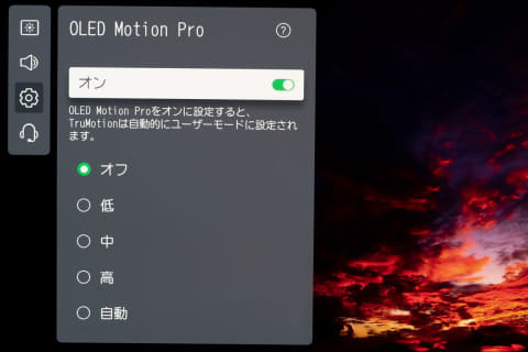 "OLED Motion Pro '는 프레임 보간 기능과 같은 자면이지만, 그렇지 않다. 이것은 이른바 블랙 삽입 기능. 검은 삽입의 타이밍은 영상 프레임 표시 후가 아니라 앞으로 새로 표시 할 프레임의 전에 삽입하기 때문에 영상 표시에 약간의 지연이 수반된다. 단지 인간의 시각 특성에 검정 삽입 후의 영상 표시 쪽이 잔상은 줄어든다. 낮은 지연을 우선한다면 오프 한 택이지만, 영상 프레임을보고 나서의 반응 속도는 검정 삽입있다 분들이 생길지도 모른다. 취향에 활용 방침을 결정하고.
