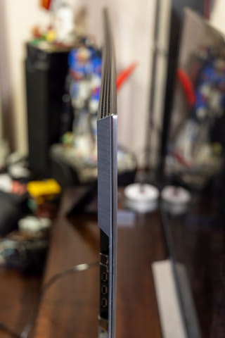 디스플레이 부의 최 외각은 폭 1.5mm 정도의 금속 테두리로 둘러싸여있다. 여기가 사실상 베젤에서 유기 EL 패널의 표시 영역까지의 폭은 화면 좌우 약 10mm, 상단에서 약 8mm, 하단에서 약 12mm. 1m 이상 떨어지면 베젤의 존재감은 거의 없다.