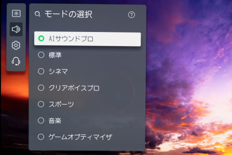 "AI 게임 환경"은 HDMI 신호를 타고 온 오디오 신호에 맞추어 최적의 가상 서라운드 모드를 선택하는 설정에서 ON / OFF의 2 택 설정된다. 본 제품만으로 게임 사운드를 즐길 때는 온 외부 음향 기기와 제휴 할 경우 꺼져 좋을 것이다.