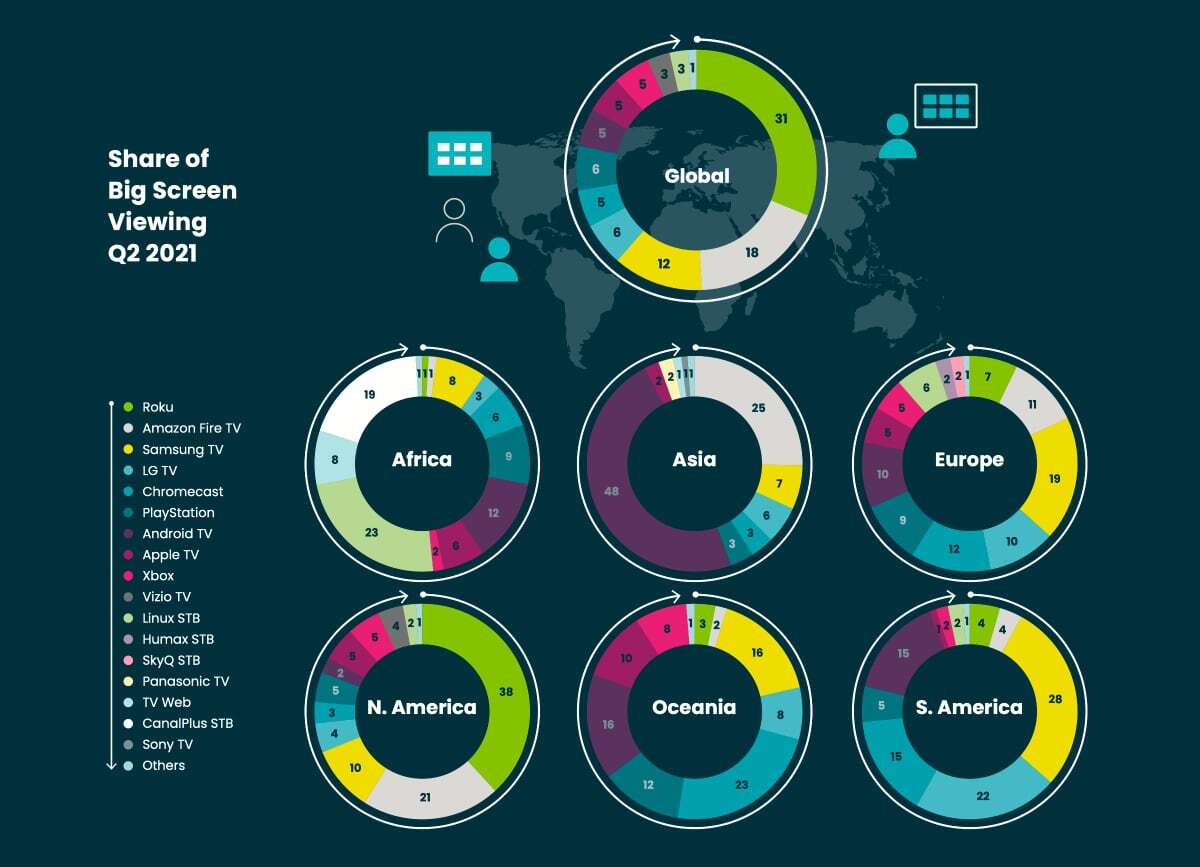 - "대형 화면은 지난 몇 분기 동안 전 세계적으로 인기를 얻고 있습니다. 2021년 2분기 전 세계적으로 Roku는 전 세계 시청 시간의 31%를 차지했으며 Amazon Fire TV와 Samsung TV는 18%와 12%로 괜찮은 시청률을 보였습니다. ," 라고 Conviva는 2021년 2분기 보고서에서 말했습니다. "아프리카와 아메리카는 큰 화면 카테고리를 주도하는 명확한 장치를 가지고 있는 반면, 유럽과 오세아니아는 훨씬 더 많은 장치 다양성을 가지고 있습니다."