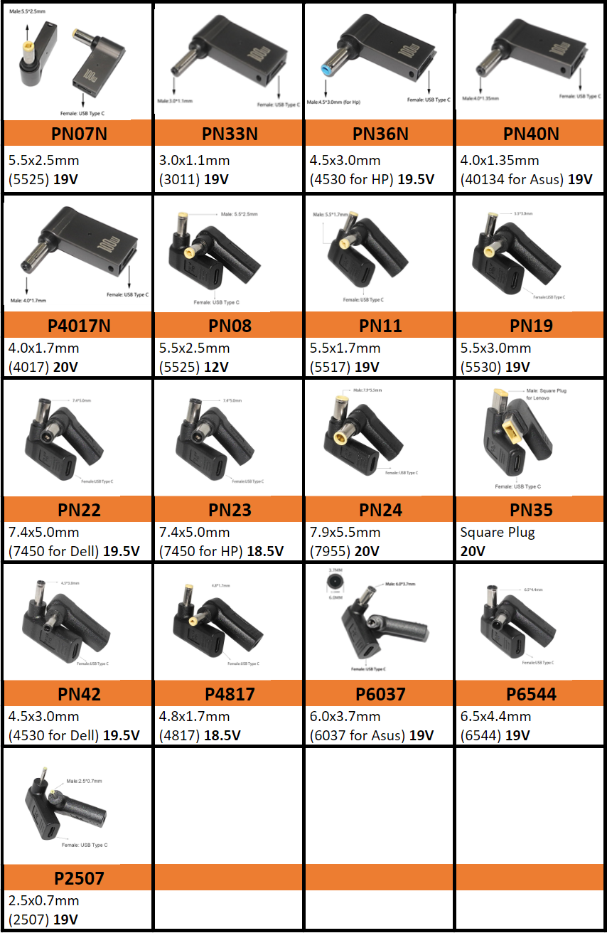 | C1 | CN07 | 5.5x2.5mm (5525) | 19V | Asus/Toshiba/Lenovo/Fujitsu: 19V/3.42A,19V/4.74A,20V/3.25A,20V/4.5A |