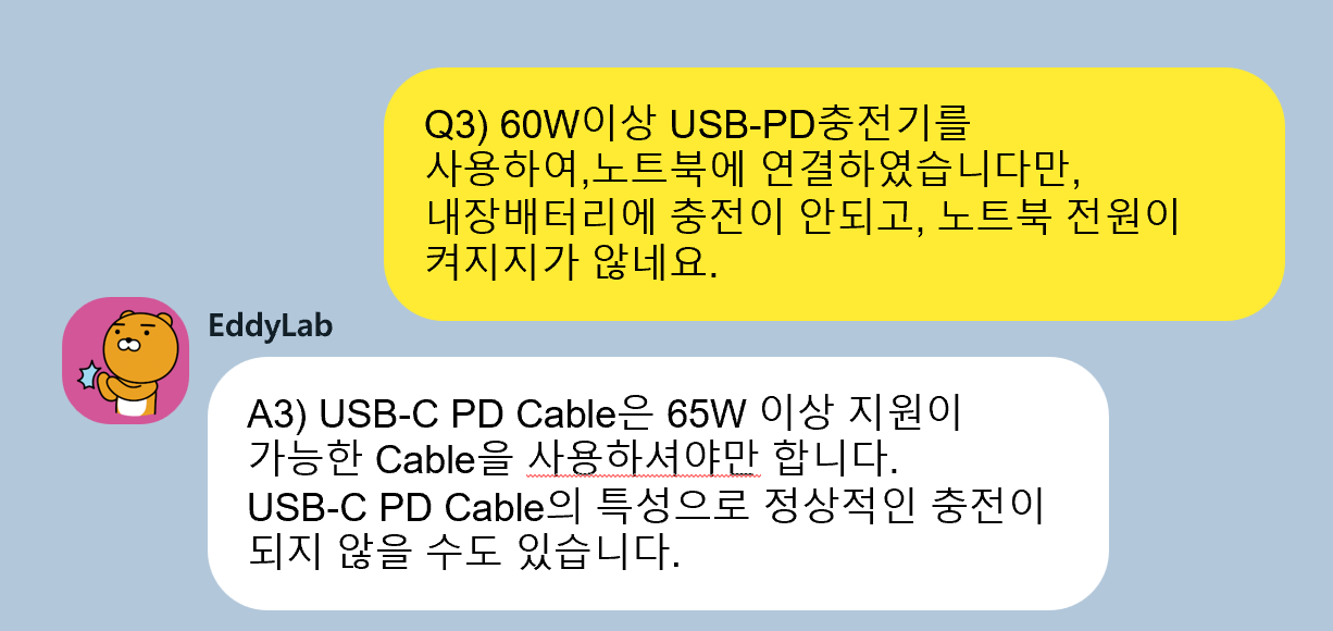 PD케이블이 정상적으로 전원공급이 되지 않는 경우가 있으므로, 참고해 주시기 바랍니다.