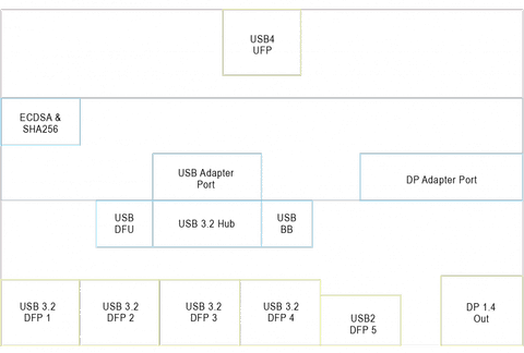 USB4 도킹 스테이션 용 제품에서 최대 40Gbps의 대역폭을 지원합니다. USB 이외에 DisplayPort의 기능도 가지고 있으며, Thunderbolt 4 / USB4 시스템에 최적화. DisplayPort 1.4a 출력과 5 개의 다운 스트림 포트 (중 4 기가 10Gbps 1 기가 480Mbps)를 포함한다. 이에 따라 최대 8K / 60Hz 디스플레이 1 대와 여러 개의 USB 3.1 장치를 동시 지원한다.