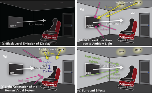 보기 환경 고려 사항은 HDR에 더 중요합니다. 특히 주변 조명 조건은 블랙 레벨의 인식과 HDR 이미지 품질의 거의 모든 측면에 큰 영향을 미칩니다. 그림 . 4 는 이러한 고려 사항을 나타냅니다. 이 자습서에서는 주변 조명의 효과에 대해 자세히 설명합니다(IDMS 섹션 B33.9.3.2, "환경 고려 사항 보기").