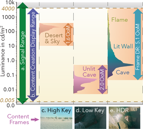 그림 . 도 2 는 SDR과 비교하여 HDR 이미징의 맥락에서 상당히 다른 또 다른 요소를 예시한다. 도형 방송 신호 전체 범위 (간의 휘도 범위 도 . 도 2a ), 디스플레이 마스터 HDR의 능력 ( 도 . 2B ), 특히 콘텐츠 프레임 ( 도 . 2C-E ). 기본적으로 (장면 유형, 노출 스타일 및 조명 상황으로 인해) 상당히 다른 다이내믹 레인지 브래킷이 있는 장면과 샷을 단일 콘텐츠 신호로 결합할 수 있으며, 반사 하이라이트를 위한 헤드룸을 유지하면서 모든 영역에서 여전히 차별화를 촉진합니다. (자세한 내용은 IDMS v1.1 섹션 B33.5.4를 참조하십시오.)