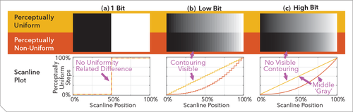 그림 . 1 은 신호 비선형성 및 비트 심도가 그레이스케일 윤곽과 같은 양자화 아티팩트의 잠재적 가시성에 미치는 영향을 설명합니다. 이러한 고려 사항은 HDR 신호가 일반적으로 10비트 또는 12비트 양자화를 사용하는 이유와 인지 양자화기(PQ) 또는 하이브리드 로그 감마(HLG) 비선형 신호(ITU-R Rec. BT.2100)의 개발 및 현재 널리 사용되는 동기를 설명합니다. 1 감마 또는 전력 함수 대신. 그림의 상단 부분에 있는 3개의 램프는 모두 상대적인 최소값과 최대값이 동일합니다. 그러나 이러한 극단 사이의 단계 수 또는 세분성은 다양합니다. 그림 . 1a1비트로만 양자화하며, 이는 두 극단을 인코딩하기에 충분하지만 중간 톤 값은 인코딩하지 않습니다. 이 예에서 도 . 도 1b 는 낮은 비트 깊이로 인코딩된 동일한 램프의 모양을 보여주어 극단 사이에 더 많은 톤 값의 가시성을 제공합니다. 그러나 비트 깊이 제한으로 인해 윤곽선 단계가 매우 두드러집니다. 마지막 예 도 . 도 1c 는 더 많은 수의 비트로 인코딩된 램프를 보여주며, 그 결과 가시적인 윤곽 아티팩트 없이 연속적인 램프가 나타납니다. 그러나 비선형성을 현명하게 선택하지 않으면 충분히 높은 비트 깊이를 사용하는 경우에도 컨투어링 아티팩트가 보일 수 있습니다. (자세한 내용은 IDMS 섹션 B33.5.2를 참조하십시오.)