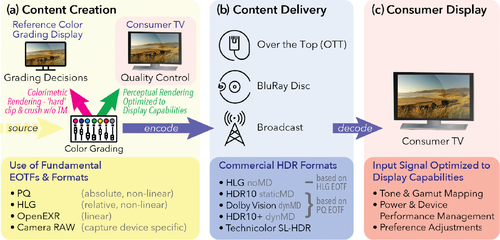 디스플레이 계측과 관련된 세 가지 기본 이미징 파이프라인 세그먼트가 있는 HDR 에코시스템: (a) 콘텐츠 생성, (b) 콘텐츠 전달, (c) 소비자 디스플레이.