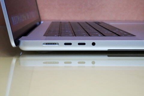 본체의 좌측면. 왼쪽에서 MagSafe 3포트, USB-C(Thunderbolt 4)×2, 헤드폰 단자