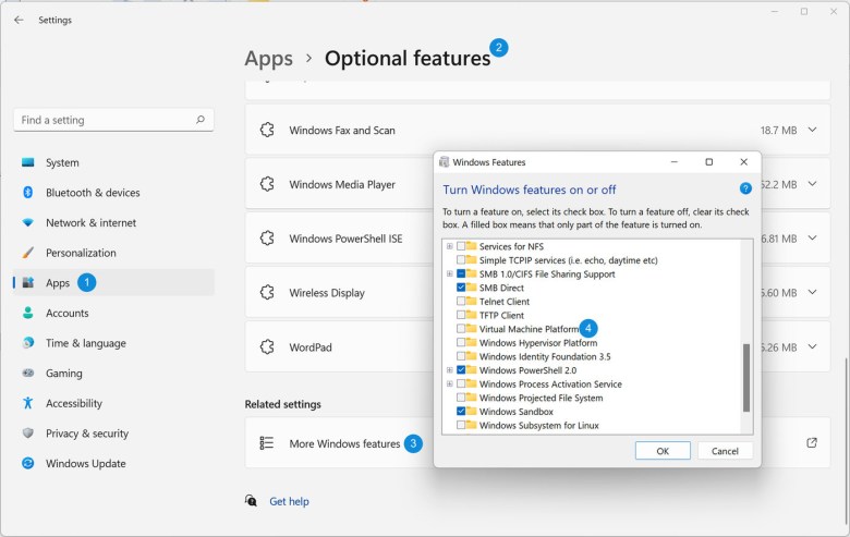 If Windows Subsystem for Android is asking user to enable “Virtual Machine Platform”, this feature can be found here: