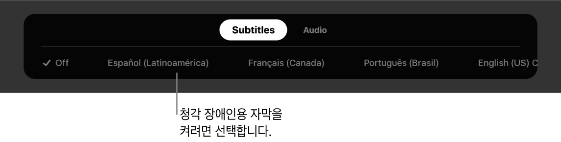 SDH(청각에 장애가 있거나 난청이 있는 사람들을 위한 자막)와 같이 특정 장애우을 지원하는 자막을 선호하는 경우 Apple TV 앱을 설정하여 일반 자막 및 청각 장애우용 자막 대신에 SDH 자막을 표시하도록 설정할 수 있습니다. 또한, 자막 및 청각 장애우용 자막의 모양을 사용자화할 수 있습니다.